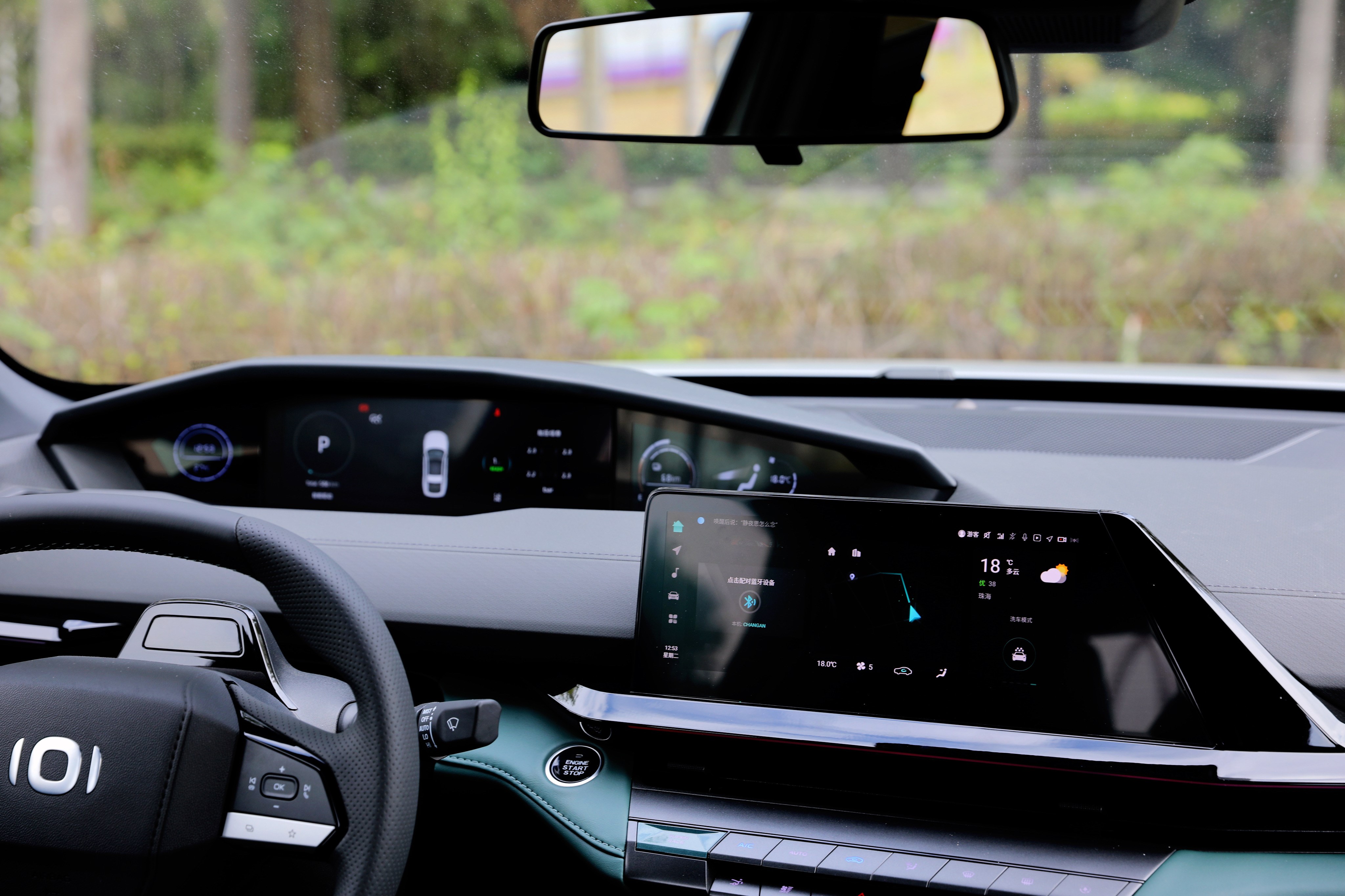 進入車內(nèi),長安啟源A06座艙風(fēng)格很獨特,富有層次感的造型讓你第一眼會感覺很復(fù)雜,但是仔細(xì)品味一番后,它特殊的風(fēng)格可以說是別有一番風(fēng)味。啟源A06提供流沙白和林蹤綠兩種面料配色,個人更喜歡林蹤綠的配色方案,更能體現(xiàn)出動感、時尚的一面。